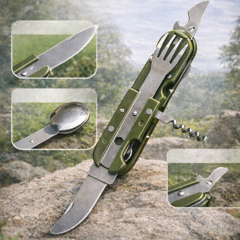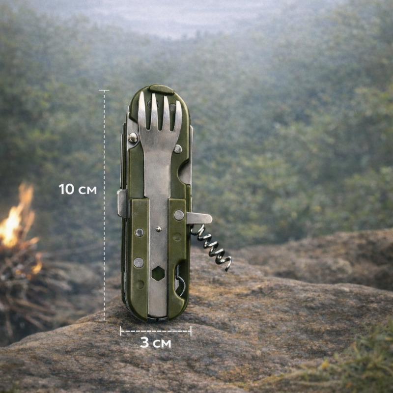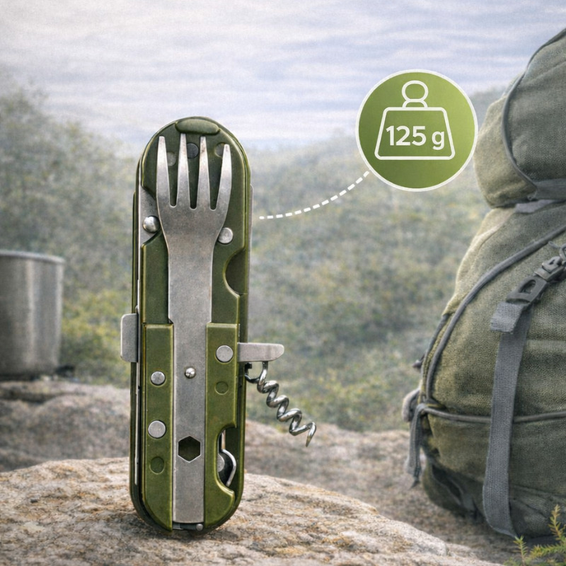 Հավաքածուում ներառված են դանակ, պատառաքաղ, շշաբացիչ, խցանահան և պատյան։ Մետաղական կառուցվածքը ապահովում է ամրություն և երկարատև օգտագործում՝ հարմար ակտիվ հանգստի և արշավների պայմաններում։ Տուրիզմի համար նախատեսված բազմաֆունկցիոնալ հավաքածուն կդառնա հարմար օգնական բնության սիրահարների համար։