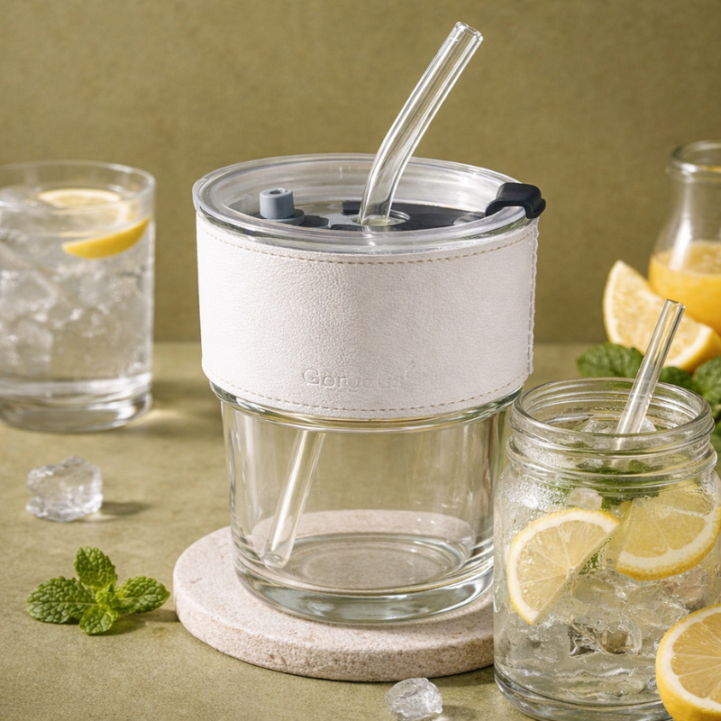Ապակե բաժակը կափարիչով և ապակե խողովակով հարմար և գեղեցիկ լուծում է սիրելի խմիչքները վայելելու համար տանը, աշխատավայրում կամ զբոսանքի ժամանակ։