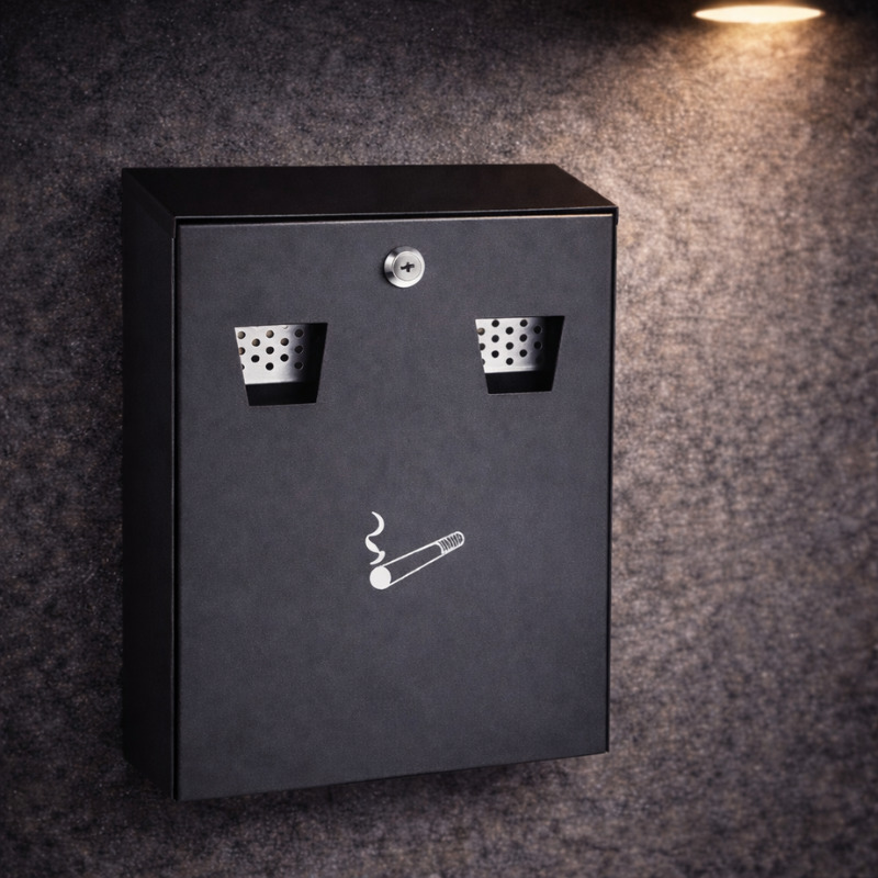 Կախովի կառուցվածքը թույլ է տալիս ամրացնել մոխրամանը պատին՝ խնայելով տարածքը և ապահովելով հարմար օգտագործում։ Կափարիչը պաշտպանում է ներսը տեղումներից և նվազեցնում է հոտի տարածումը։