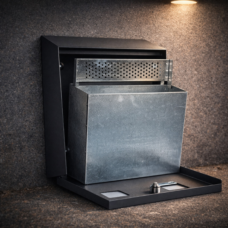 Մոխրամանը ունի կողպեք, որը ապահովում է անվտանգություն և պաշտպանում է ներսի պարունակությունը։ Հավաքածուում ներառված են բանալիներ։