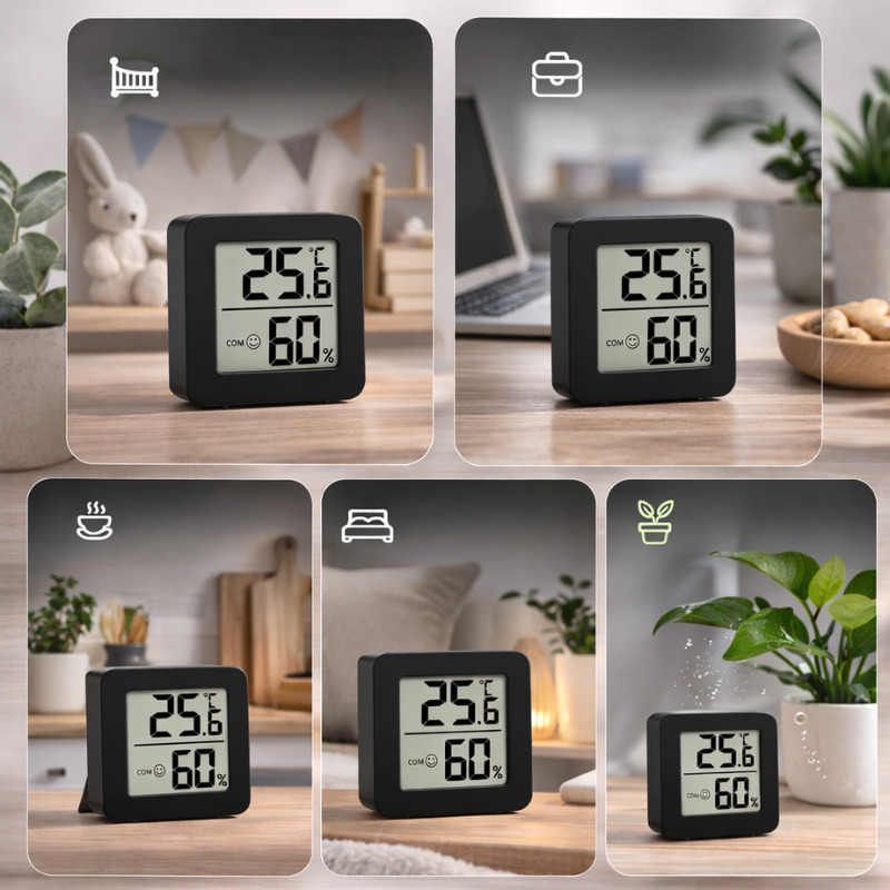 Էլեկտրոնային ջերմաչափը համակցված է բարձր ճշգրտությամբ խոնավաչափի հետ, ինչը թույլ է տալիս շարունակաբար վերահսկել ջերմաստիճանը և խոնավությունը։ Տվյալները ցուցադրվում են LED էկրանին՝ պարզ և ընթեռնելի ձևով։