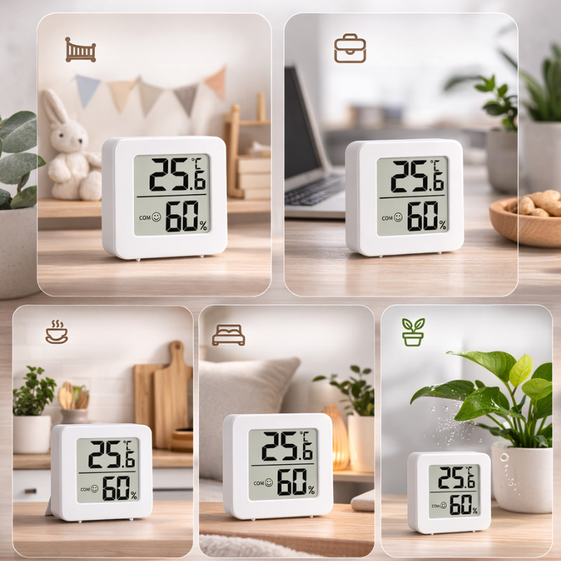 Էլեկտրոնային ջերմաչափը համակցված է բարձր ճշգրտությամբ խոնավաչափի հետ, ինչը թույլ է տալիս շարունակաբար վերահսկել ջերմաստիճանը և խոնավությունը։ Տվյալները ցուցադրվում են LED էկրանին՝ պարզ և ընթեռնելի ձևով։